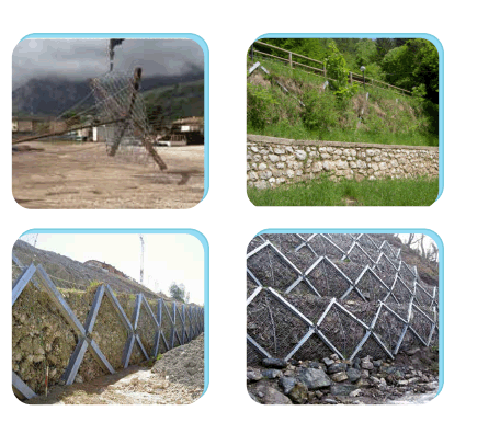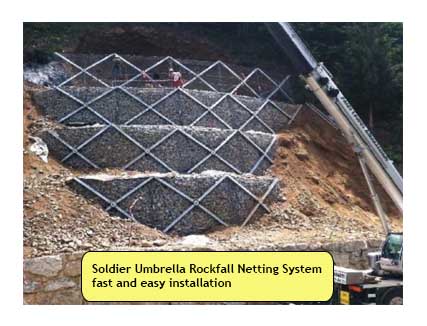 Geoviro Umbrella system is a patented structure for protection and linear containment, composed of single elements. Pre-assembled on-site, Umbrella is made of frontal mesh face, of steel posts connected each other in shape of St. Andrew cross and of a central joint which connects the steel wire mesh face to an anchorage element, suitable for specific characteristics of site installation. Depending on site condition and problem, Geoviro Umbrella can be used as retaining wall, stabilized unstable slopes, protection against rockfall, landslide barrier, also to be used as emergency access road. And also embankment construction for road support. Geoviro Umbrella system may be carried directly on site and immediately installed, with many advantages: easy transport, quick and simple installation, minimal amount of space, low environmental and visual impact.