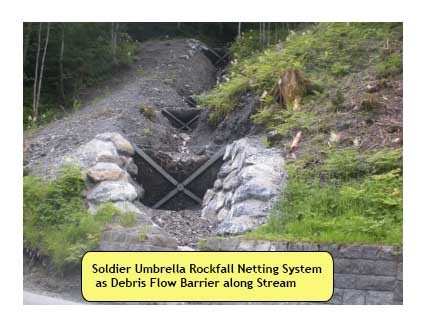 Geoviro Umbrella system is a patented structure for protection and linear containment, composed of single elements. Pre-assembled on-site, Umbrella is made of frontal mesh face, of steel posts connected each other in shape of St. Andrew cross and of a central joint which connects the steel wire mesh face to an anchorage element, suitable for specific characteristics of site installation. Depending on site condition and problem, Geoviro Umbrella can be used as retaining wall, stabilized unstable slopes, protection against rockfall, landslide barrier, also to be used as emergency access road. And also embankment construction for road support. Geoviro Umbrella system may be carried directly on site and immediately installed, with many advantages: easy transport, quick and simple installation, minimal amount of space, low environmental and visual impact.